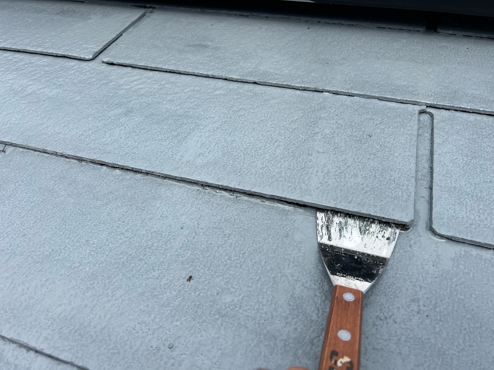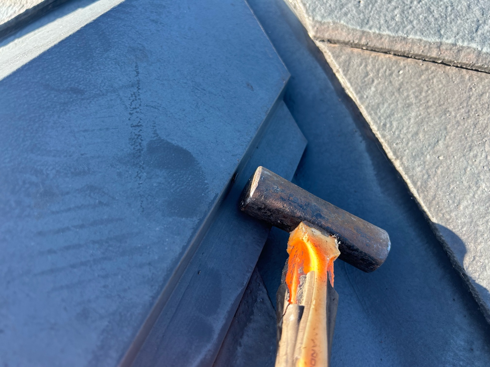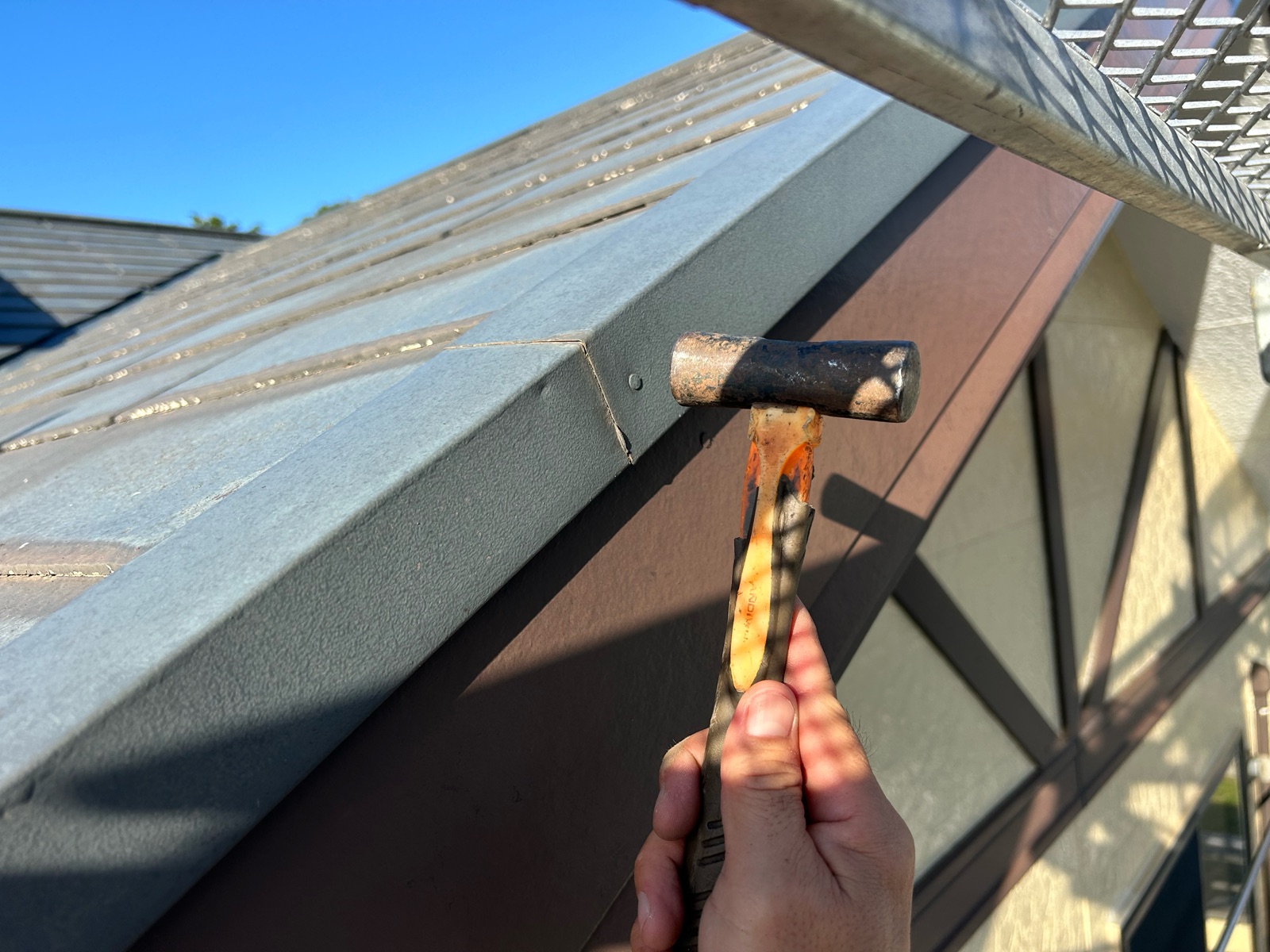 有限会社石毛塗装では屋根塗装前にすべての棟板金の点検します。浮いている個所は増し打ち、効いていない箇所は新たに増やして打ち込みます。